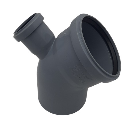 Отвод канализационный Ростурпласт диаметром 110 мм под углом 45 градусов для монтажа систем внутренней канализации. Имеет выход вверх для трубы диаметром 50 мм.