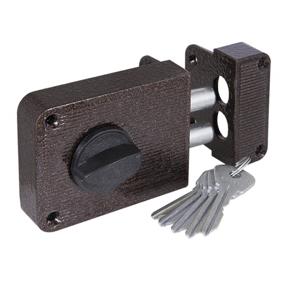Замок накладной цилиндровый с вертушкой. Предназначен для установки на деревянные двери. Засов из двух цилиндрических ригелей диаметром 14 мм, с максимальным вылетом 25 мм. Удаление ключевого отверстия - 60 мм. Габариты замка - 100х75х24,5 мм. Комплектация - 4 ключей, запорная планка, накладка. Закрывание и открывание замка изнутри производится ручкой, снаружи ключом. Корпус из ударопрочного пластика со стальной пластиной.